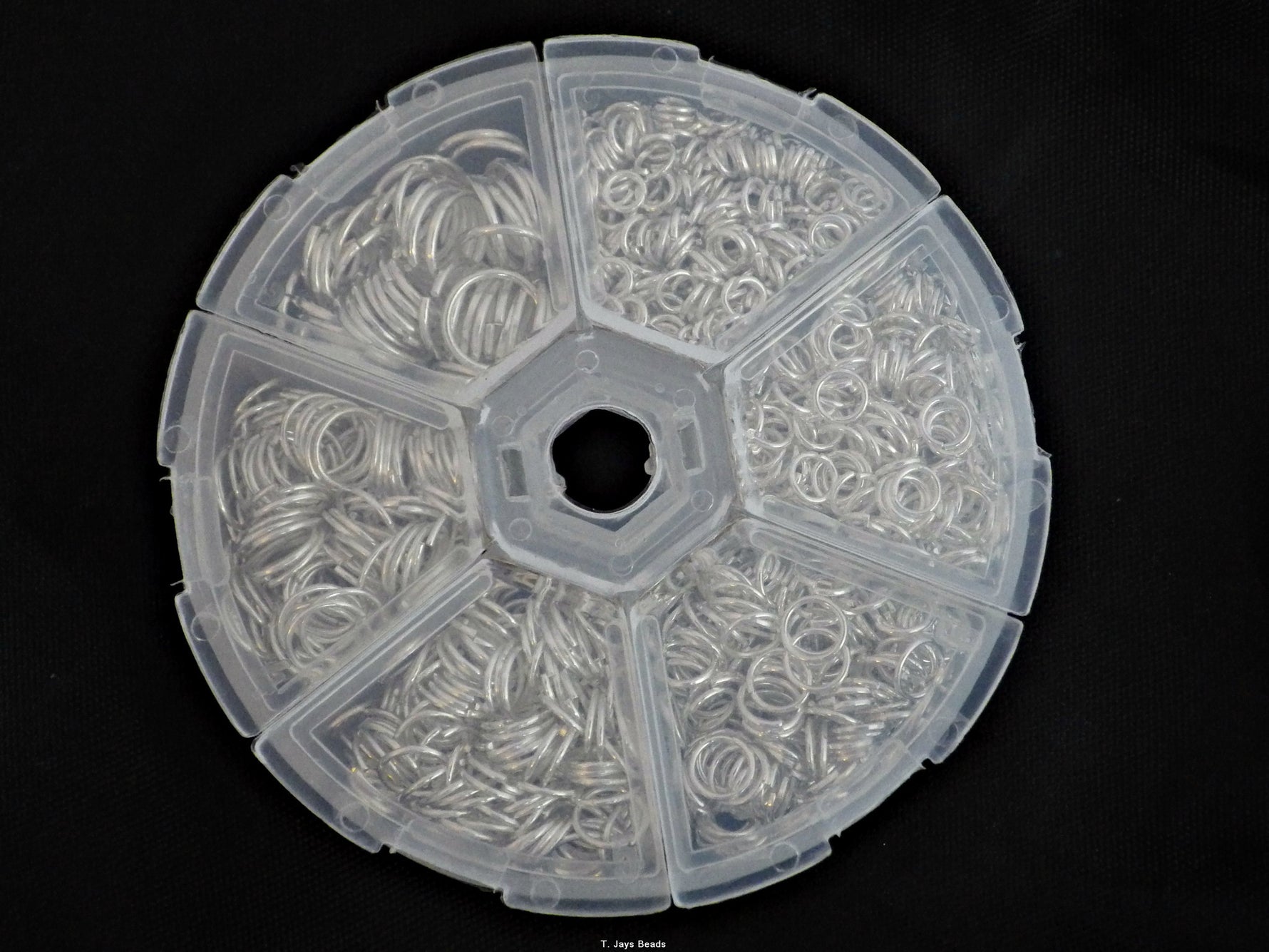 - Box of iron jump rings with 6 sections of different sized jump rings